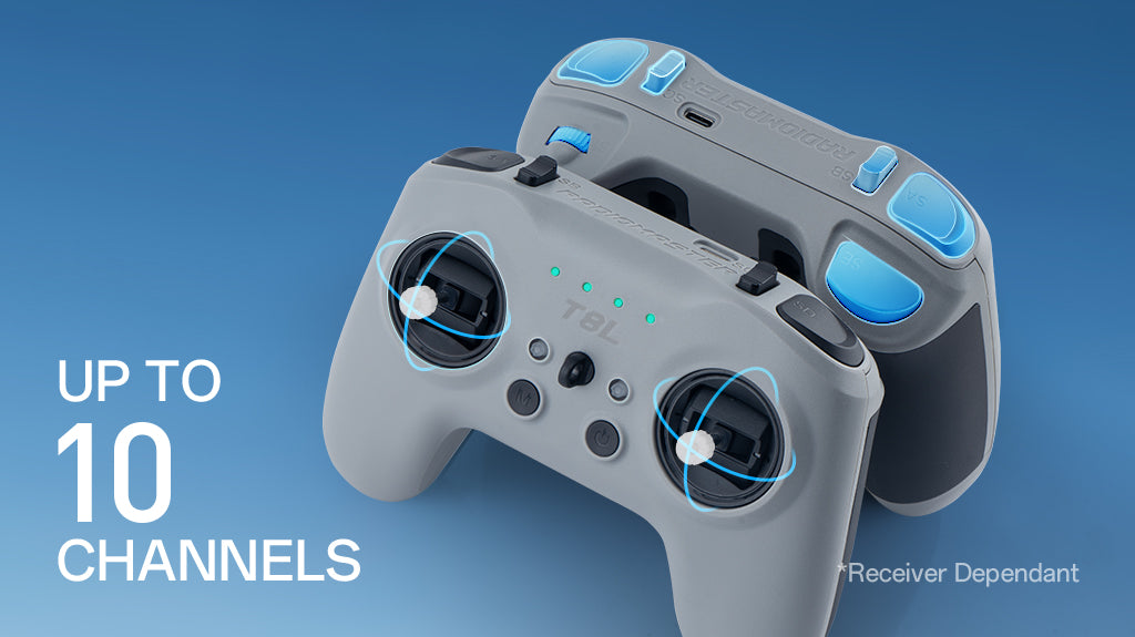 The RadioMaster T8L brings the power of ExpressLRS 2.4GHz into a clean, compact form — and is the first screenless radio controller officially supported by ExpressLRS.
